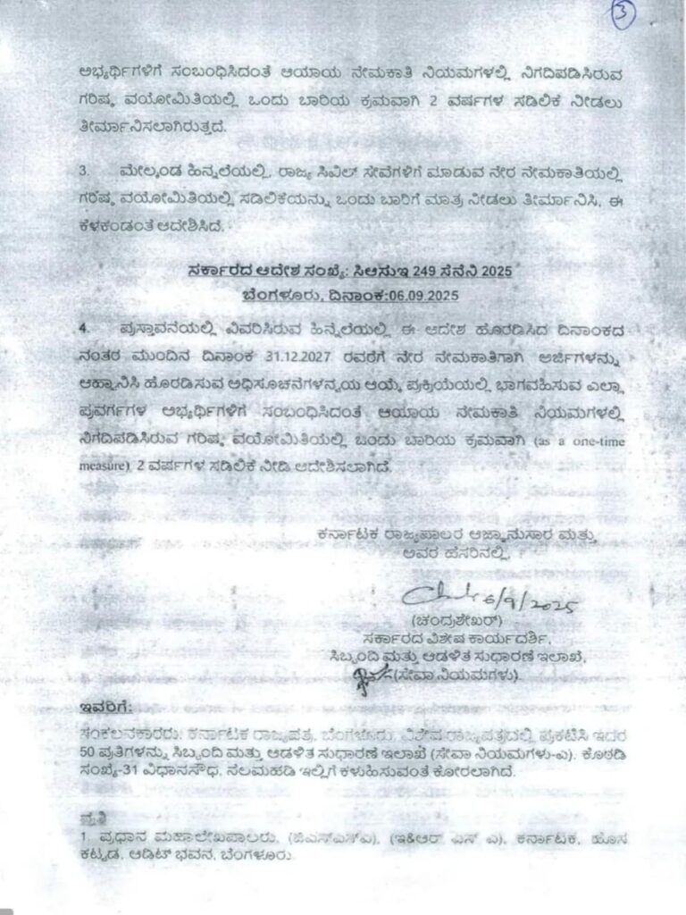 ಈ ಒಂದು ಬಾರಿ ವಯೋಮಿತಿ ಸಡಿಲಿಕೆ 2025ರಲ್ಲಿ ಆರಂಭಗೊಳ್ಳುವ ಪೊಲೀಸ್ ನೇಮಕಾತಿ ಸೂಚನೆಗಳಿಗೆ ಅನ್ವಯವಾಗುವಂತೆ ವಿಧಾನಸಭೆ ಮತ್ತು ಇಲಾಖಾ ಮಟ್ಟದ ಚರ್ಚೆಗಳು ನಡೆದಿವೆ ಎಂಬ ಸುದ್ದಿ ವರದಿಗಳು ಲಭ್ಯವಿವೆ, ಆದರೆ ಪ್ರತಿಯೊಂದು ಹುದ್ದೆಯ ಅಧಿಕೃತ ಅಧಿಸೂಚನೆಯಲ್ಲಿ ಅಂತಿಮ ದಿನಾಂಕಾವಳಿಗಳು ಸ್ಪಷ್ಟವಾಗುತ್ತವೆ ಎಂಬುದು ಮಹತ್ವಪೂರ್ಣ. ಪ್ರಕಟವಾಗುವ ಪ್ರತಿಯೊಂದು KSP Recruitment 2025 Notificationನಲ್ಲಿ (ಕಾನ್ಸ್ಟೇಬಲ್/PSI ಮತ್ತಿತರ) ವಯೋಮಿತಿ ಹಾಗೂ ಸಡಿಲಿಕೆಯ ಚಿತ್ರಣ ಸ್ಪಷ್ಟವಾಗಿ ನೀಡಲಾಗುತ್ತದೆ ಹಾಗೂ ಅದನ್ನು KSP ಅಧಿಕೃತ ತಾಣದಲ್ಲಿ ಪರಿಶೀಲಿಸಬೇಕು.
